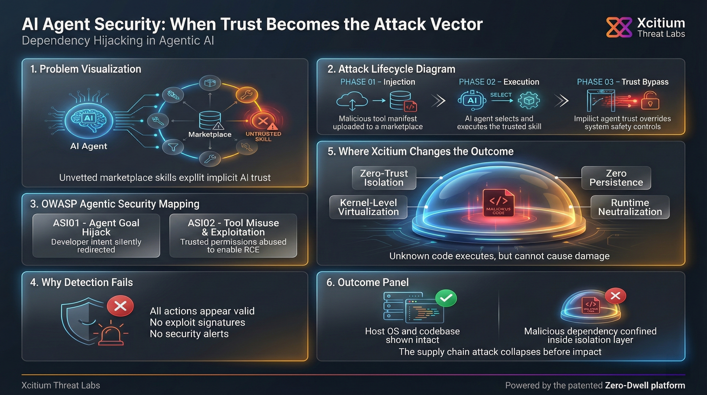 Explore dependency hijacking in AI agents, a critical supply chain risk. Learn how malicious marketplace skills exploit AI trust, impacting OWASP ASI01 and ASI02, and discover advanced zero-trust defenses.