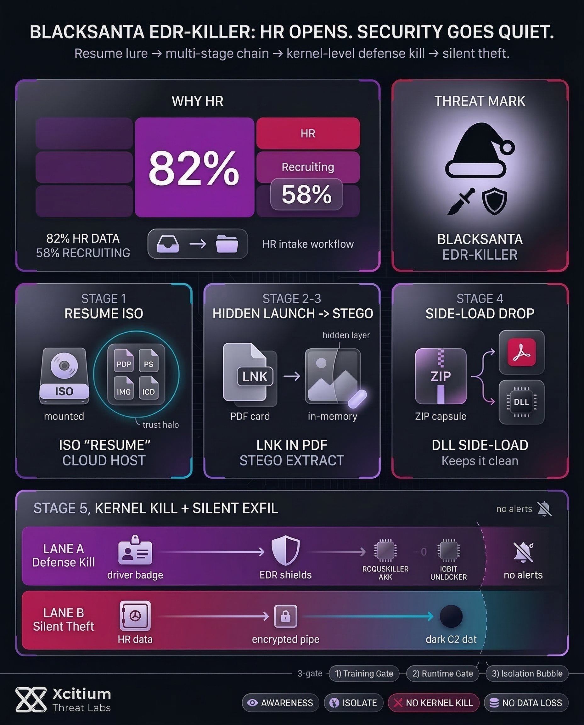 BlackSanta is built for one purpose, get past human trust, then shut down the defenses that would normally stop the intrusion. A recruiter receives a “resume” ISO hosted on trusted cloud infrastructure. A hidden shortcut launches PowerShell, steganography extracts code from an image, then a trojanized PDF reader side-loads a malicious DLL. Within minutes, the campaign escalates into kernel-level defense disabling and silent data theft.