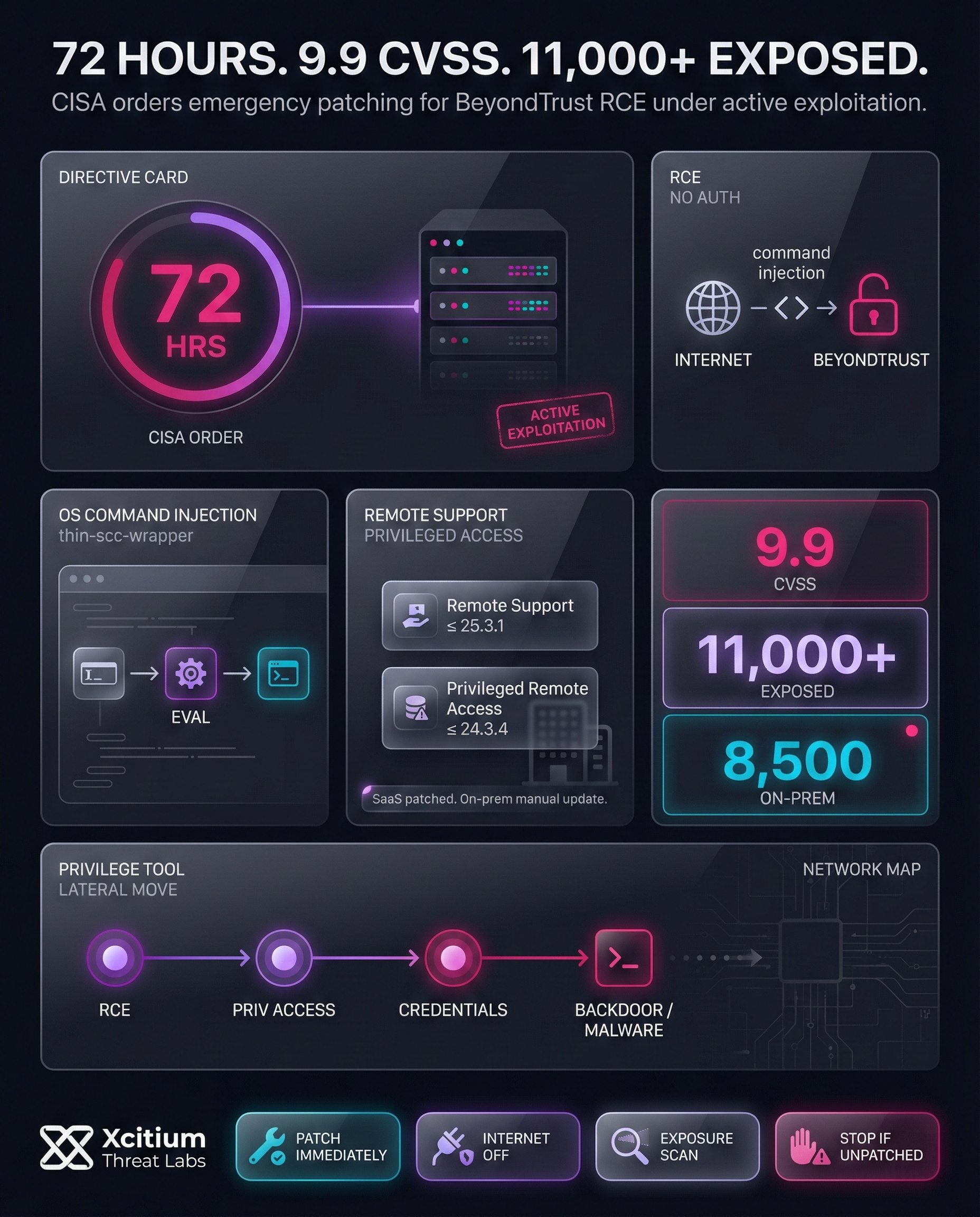 BeyondTrust Remote Support and Privileged Remote Access sit on the most sensitive path in the environment, privileged access. When an internet-exposed instance is vulnerable, attackers can execute system commands without user interaction, then pivot to credentials, backdoors, and lateral movement.