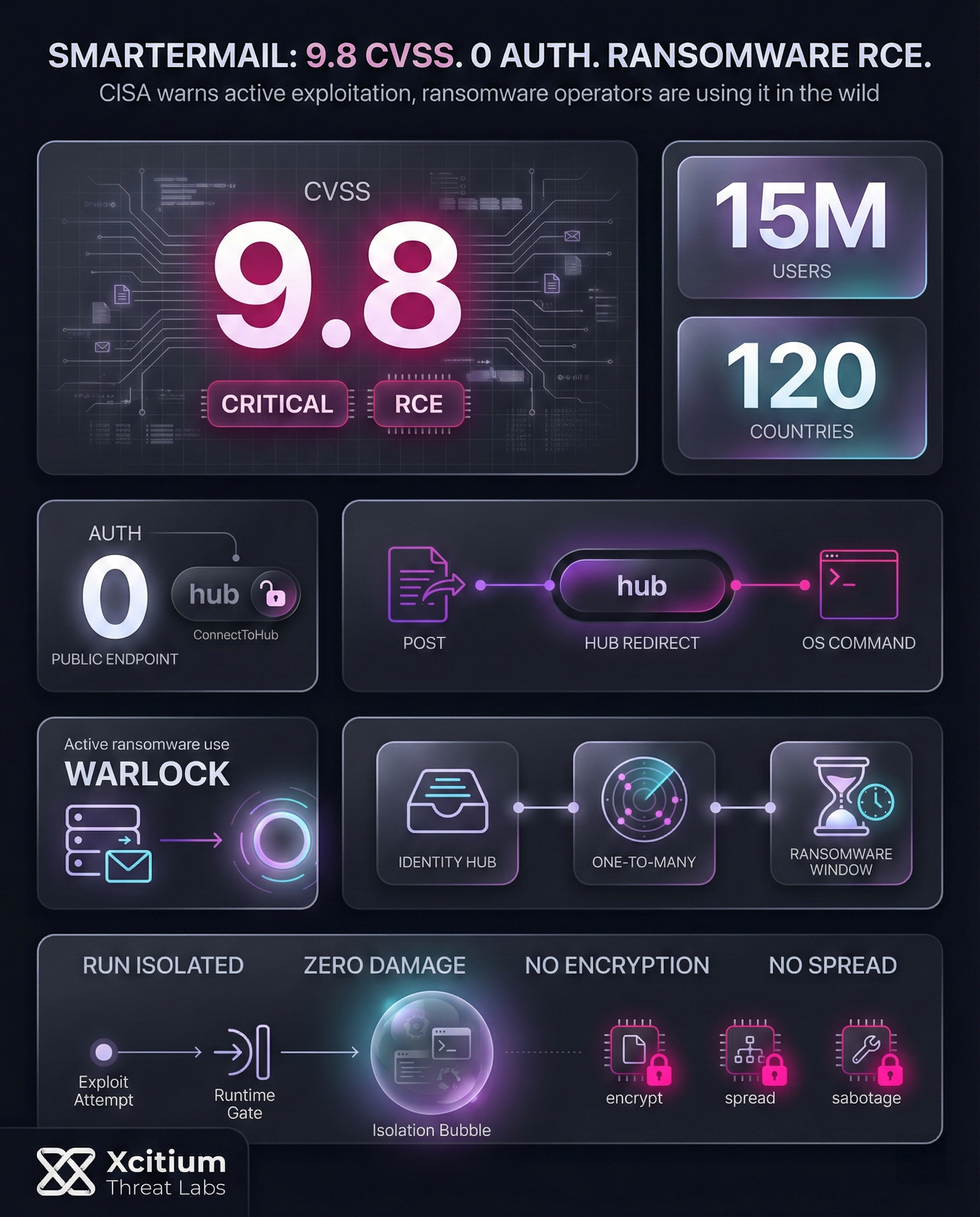 - Warlock Ransomware: The “Warlock” group used the RCE bug and an admin-password-reset bug to fully hijack a SmarterMail instance.