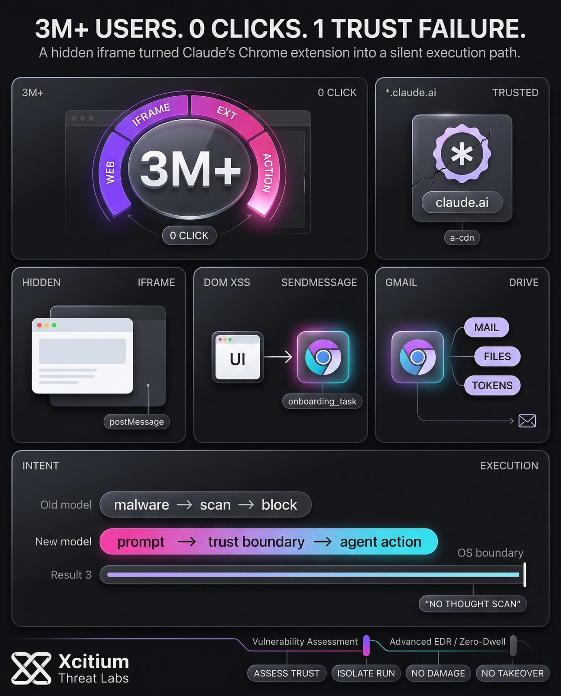 - Xcitium Advanced EDR, powered by Xcitium’s patented Zero-Dwell platform, enforces the OS boundary when AI-driven actions attempt execution. Code can run without being able to cause damage, which prevents the follow-on step from turning assistant hijack into system compromise