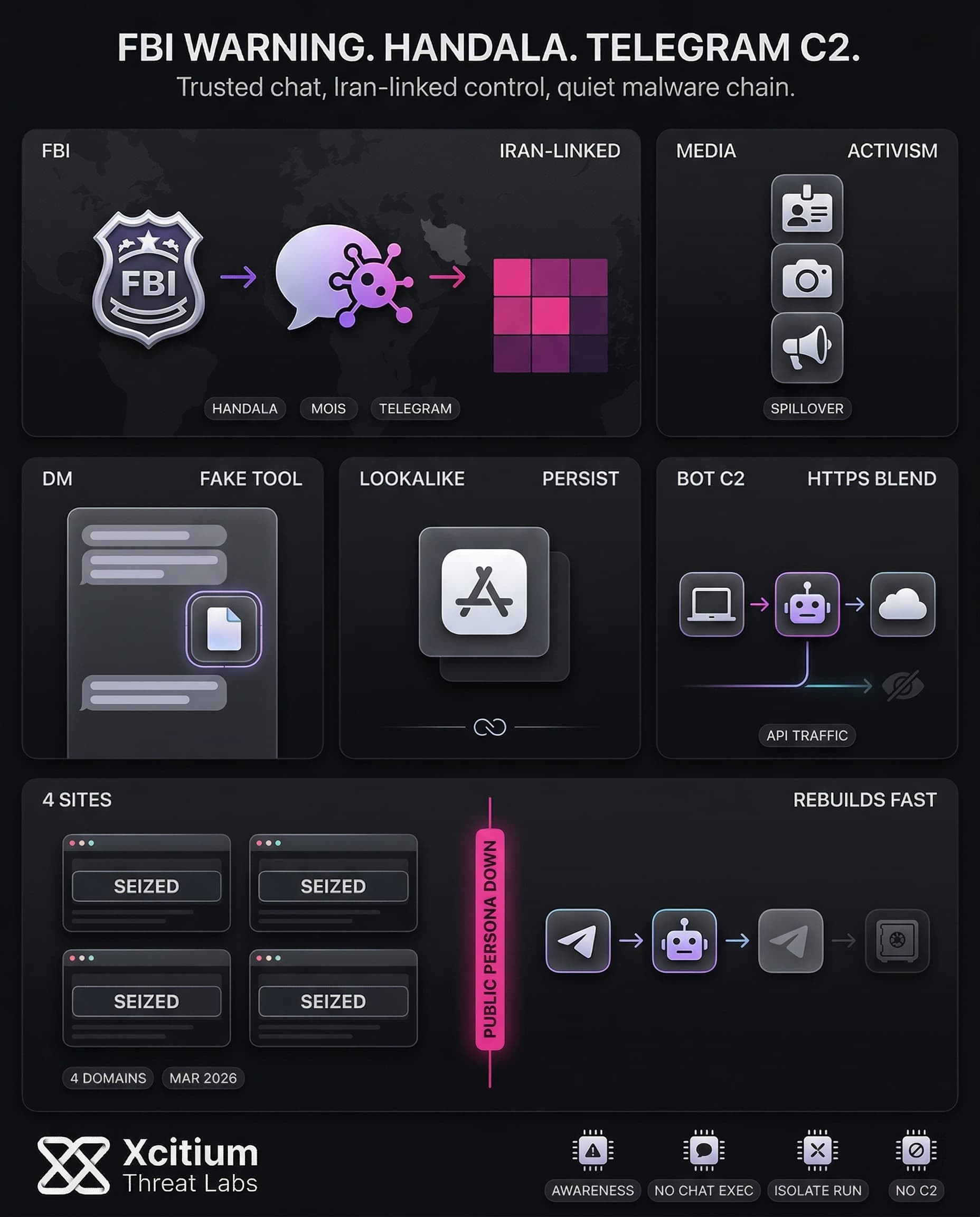 The Handala campaign shows how modern malware no longer needs suspicious infrastructure to stay hidden. By delivering fake “security tools” through direct messages and then using Telegram bots as command and control, the attackers turned a widely trusted platform into both the lure and the control plane. The victim sees a familiar app. The network sees normal HTTPS traffic. The attacker gets remote access, surveillance capability, and data theft.