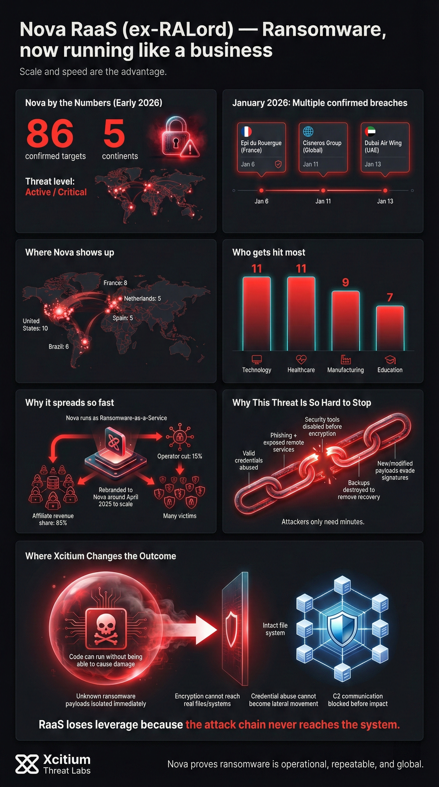 Nova proves that ransomware is no longer rare or slow. It is operational, repeatable, and global. Defense must move faster than affiliates can deploy payloads.