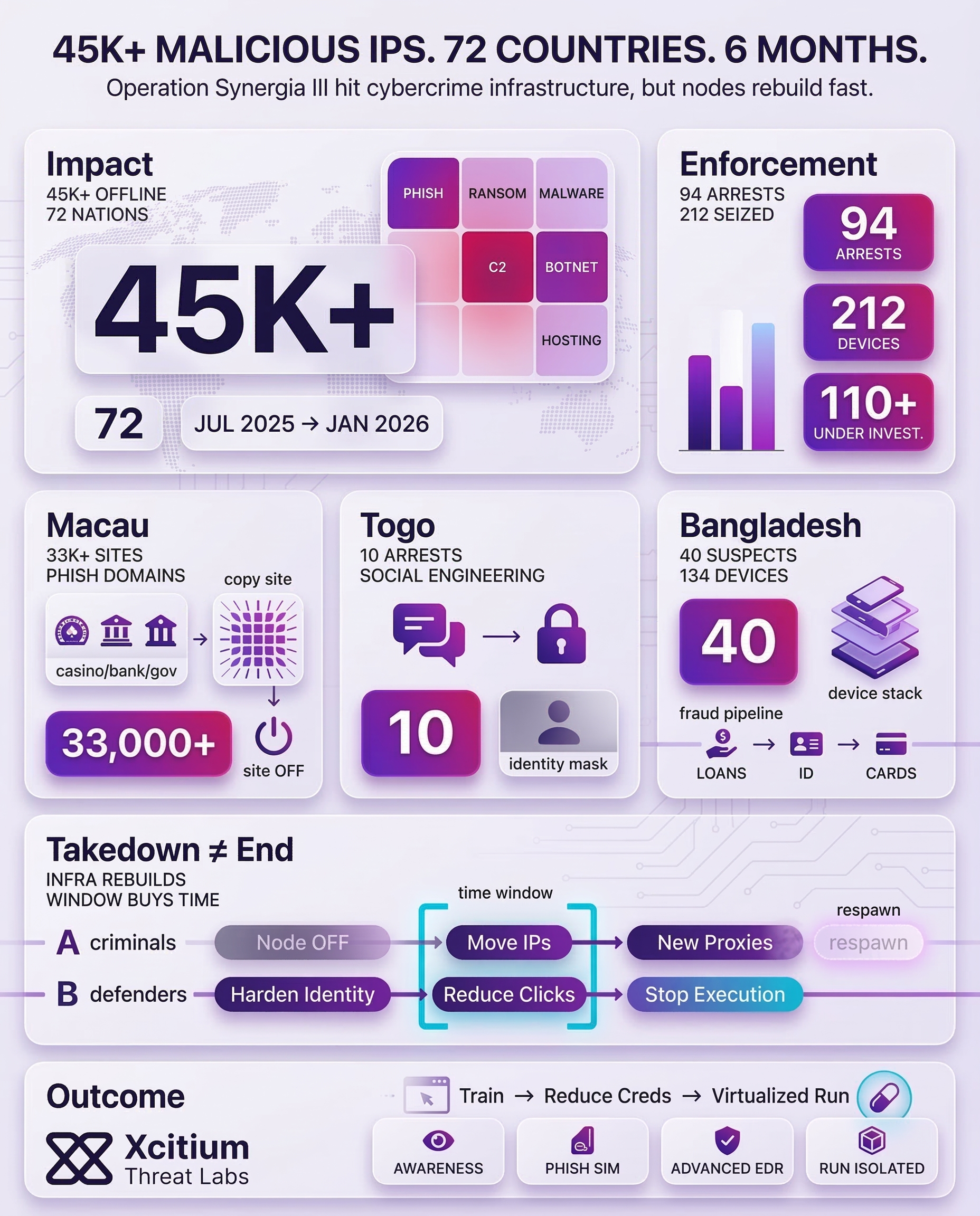 Operation Synergia III shows what coordinated enforcement can achieve. Across 72 countries, Interpol and partners disrupted 45,000+ malicious IPs and servers, confirmed 94 arrests, and seized 212 devices, targeting infrastructure used for phishing, malware, and ransomware.