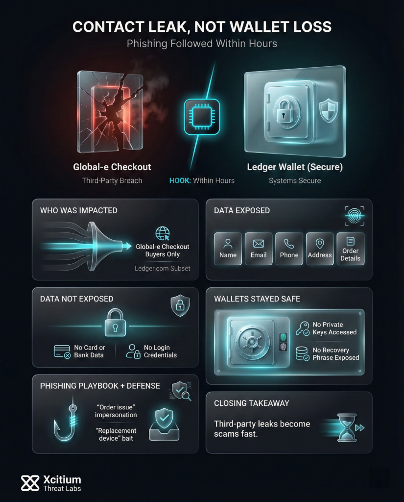 The Global-e breach shows how third-party incidents create immediate real-world risk for customers, even when core systems remain secure. Ledger confirmed its network, hardware wallets, and wallet secrets were not accessed. The exposed data was purchase and contact information, which is exactly what scammers need to run convincing follow-up scams.