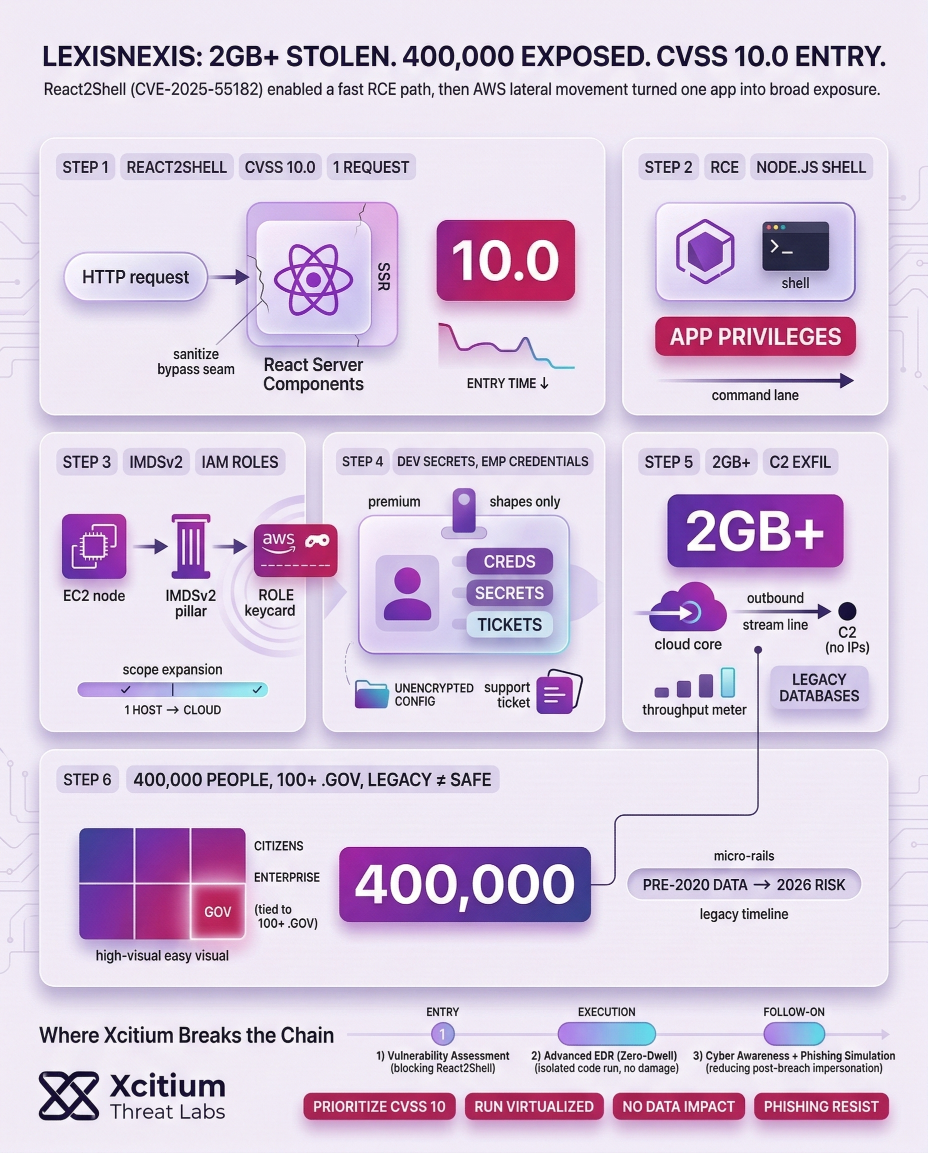 The actors involved in the intrusion revealed their activities on a cybercrime forum, which revealed the extortion plan against LexisNexis, though it did not come to pass. According to the actors, the extortion plan would involve the ‘React2Shell‘ vulnerability, also known as CVE-2025-55182, and AWS instances, which would allow the actors to access the system illegally. This critical vulnerability has a CVSS score of 10.0, allowing attackers to execute the code on the target system with a single, specially crafted HTTP request. Exploiting this vulnerability is a matter of high severity.