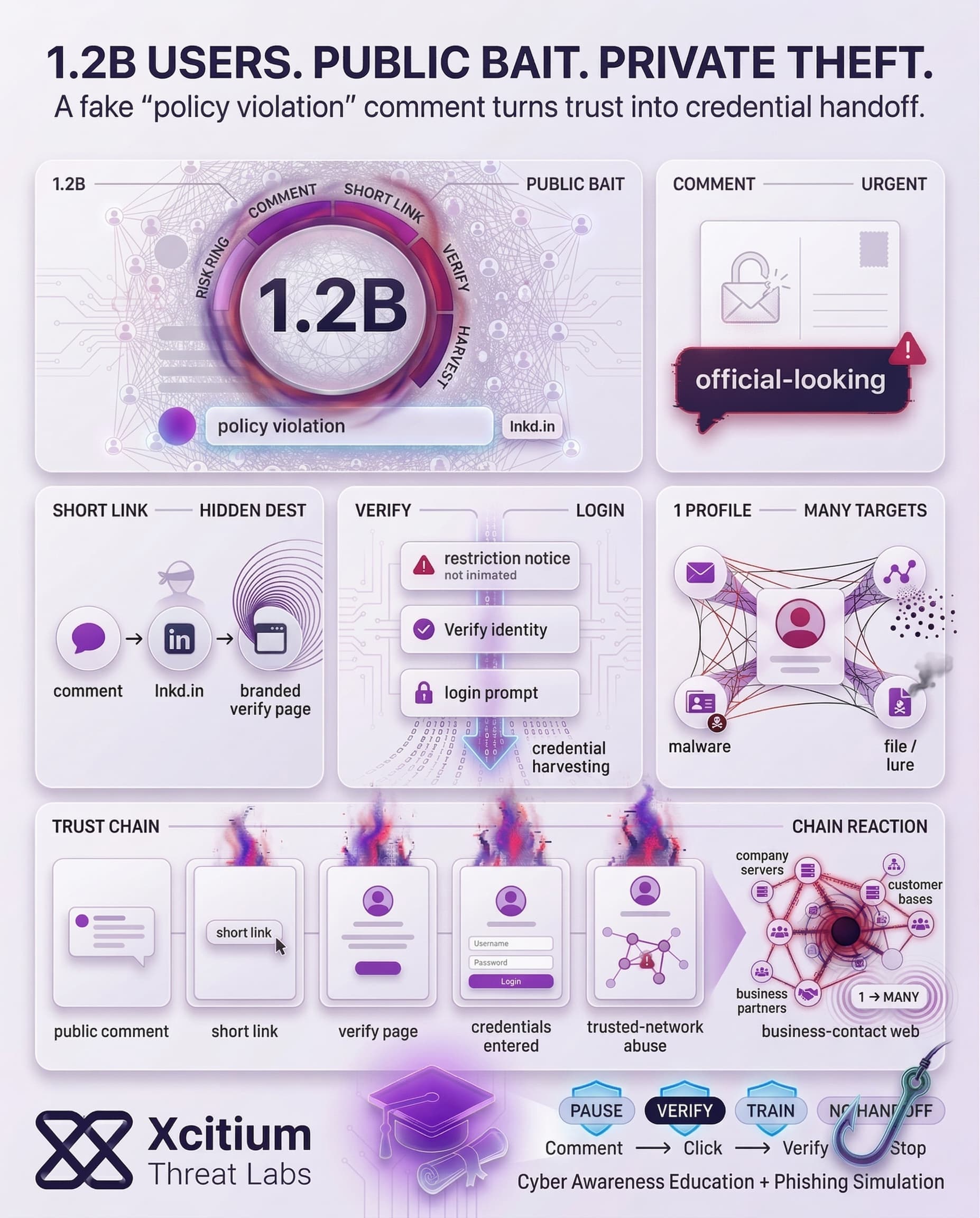 This campaign shows how phishing evolves when attackers can borrow credibility from the platform they are targeting. Fake “policy violation” comments create urgency in public, then route victims through LinkedIn branded pages and lnkd.in shortened links that look legitimate at first glance. In a network of 1.2B users, even a small conversion rate becomes a credential harvesting engine.