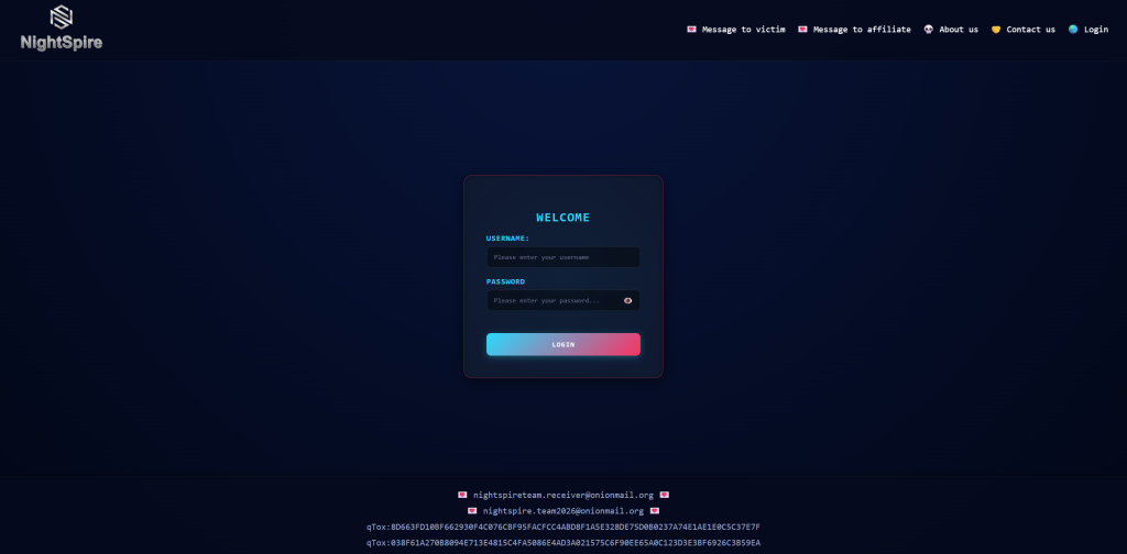 night.spire.team@gmail.com,night.spire.team@proton.me, andnight.spire.team@onionmail.org. The group also maintains a Telegram channel (t.me/night_spire_team) for negotiation and publication of leaks. - Leak-site URLs (Tor):