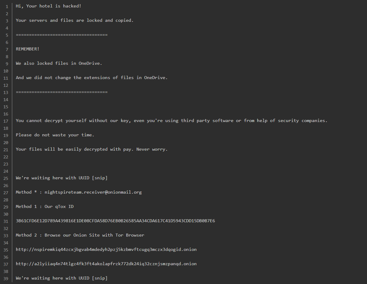 .nspire.’ On the victim’s computer, ransomware infection leaves default ransom notes like ‘readme.txt,’ ‘readme_2.txt,’ or ‘nightspire_readme.txt.’ - Infrastructure: The IP address 14.139.185.60 was associated with the WinSCP data server of the NightSpire group. Hostnames like