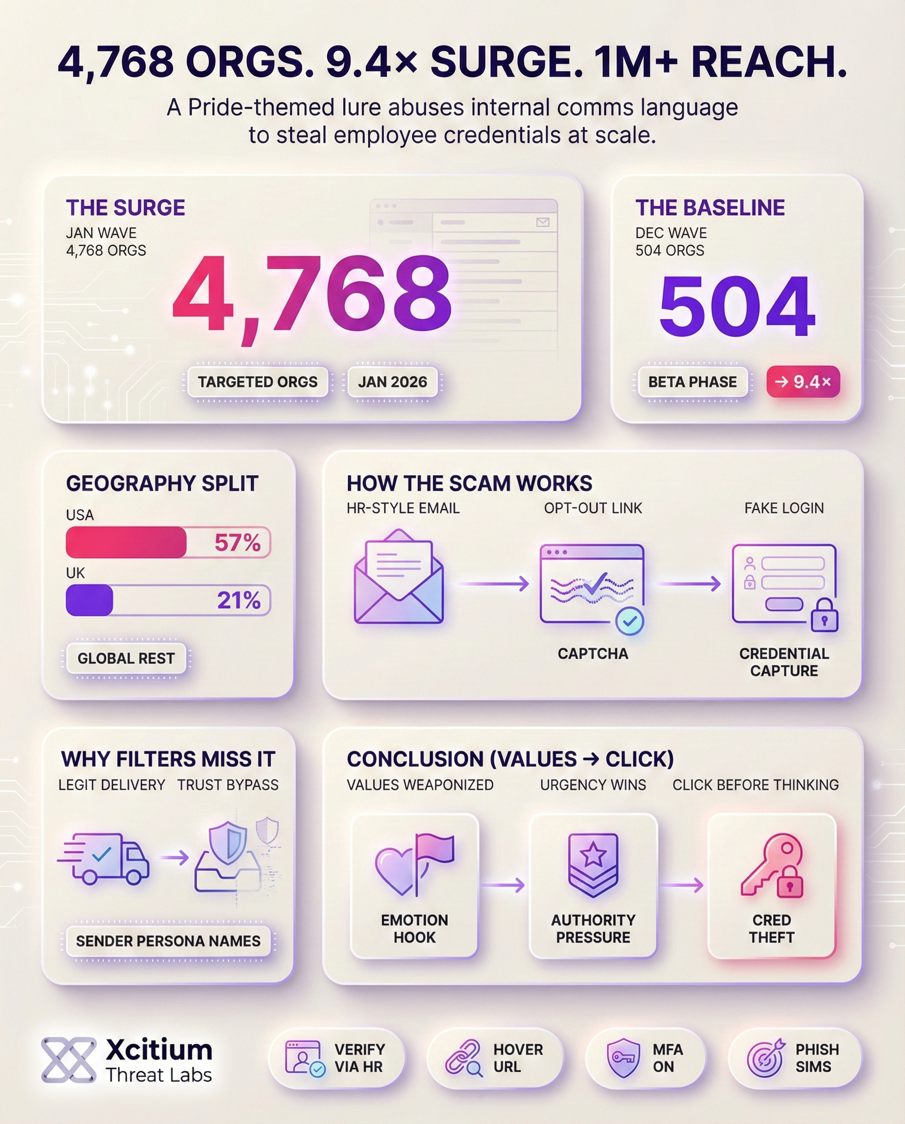 The Pride themed phishing campaign proves how quickly attackers can turn legitimate internal culture into a credential theft operation. Two waves, Dec 2025 and Jan 2026, used trusted email delivery infrastructure, realistic HR style messaging, and an opt out hook that redirected employees to a fake login flow after a CAPTCHA step.