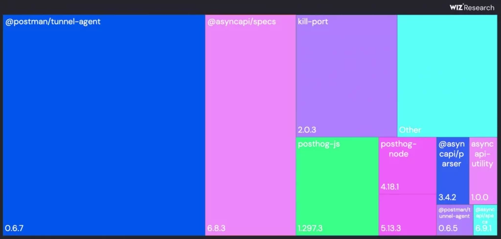 Researchers identified @postman/tunnel-agent@0.6.7 and @asyncapi/specs@6.8.3 as the top infected packages, together accounting for over 60% of all infections.