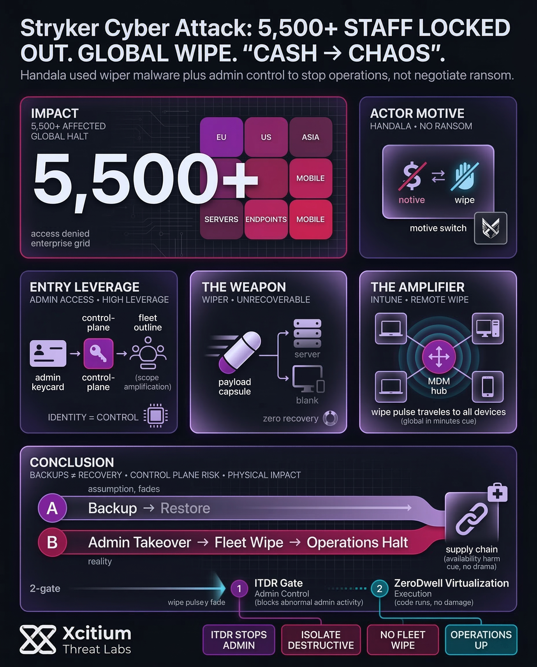 The Stryker incident shows a shift from cash to chaos. This was not an extortion play, it was a destructive breach that denied thousands of staff access, disrupted global operations, and aimed to erase corporate data across servers and Intune-managed devices.