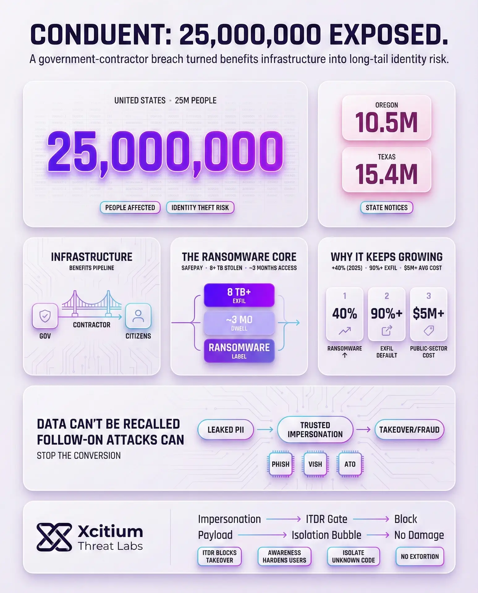 The Conduent incident shows why large scale exposures create long tail risk. Once sensitive identity data is copied, it cannot be recalled. What follows is predictable, criminals convert stolen records into impersonation, account takeover, and fraud for months or years. You cannot stop the fact that data was taken, but you can stop what attackers try to do with it next.