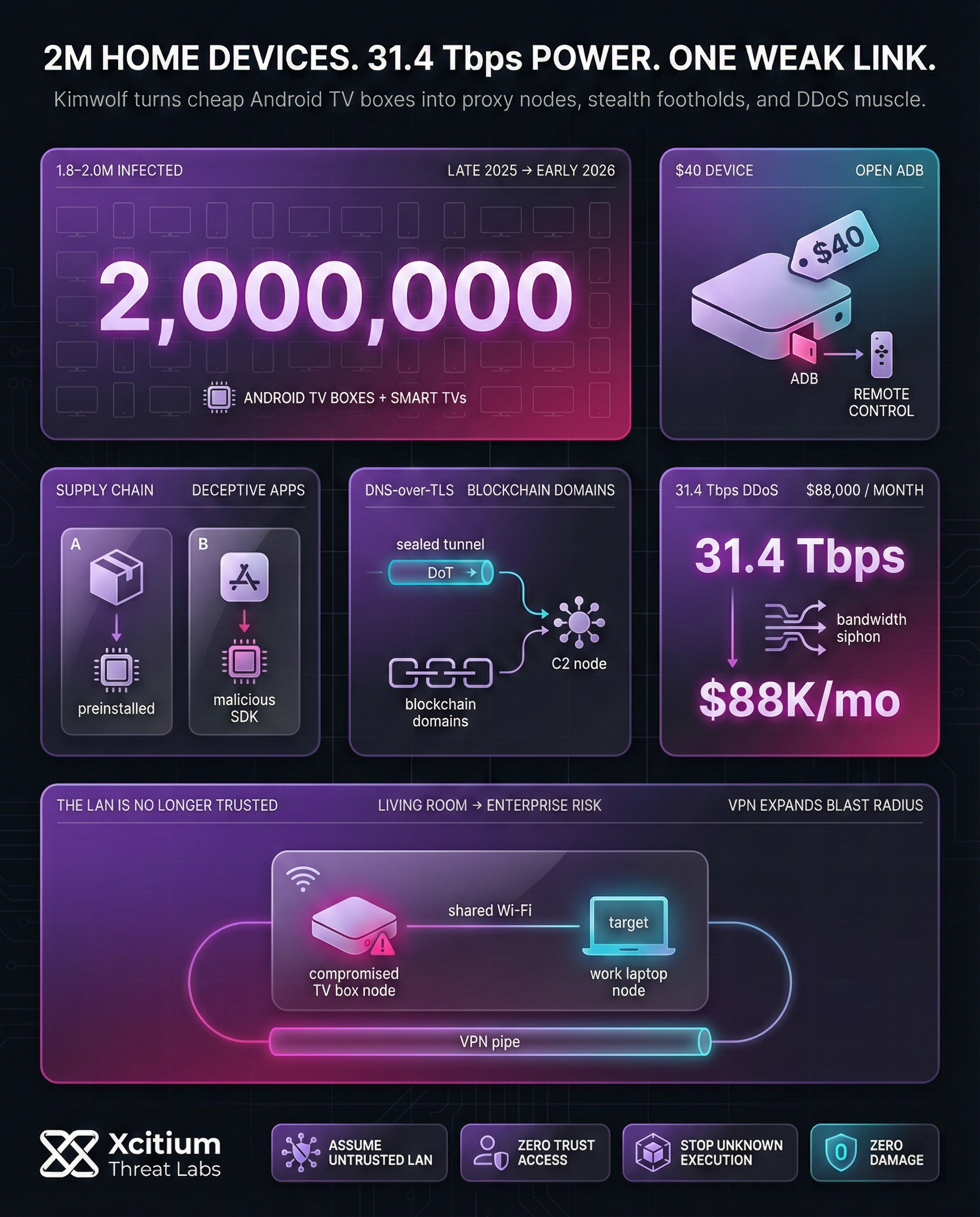 Kimwolf shows how quickly consumer IoT can become operational risk. A low-cost Android TV box can be compromised at scale, then repurposed as a residential proxy node, a stealthy foothold, or part of massive DDoS activity, all while sharing the same WiFi as corporate endpoints.