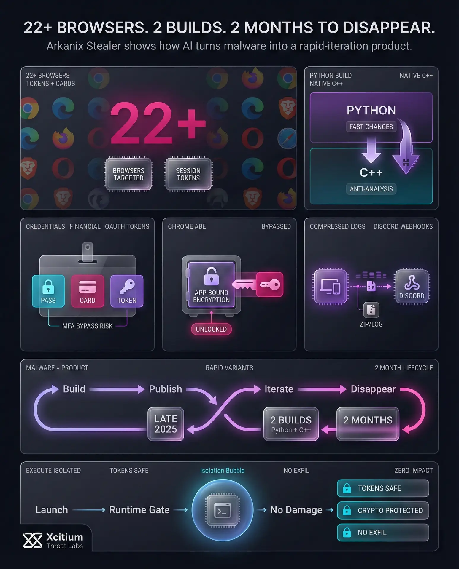 Arkanix Stealer is a clear example of how AI is lowering the barrier to building sophisticated cybercrime tooling. In late 2025 it surfaced with two operational tracks, a Python based build optimized for fast changes, and a premium native C++ build hardened with anti analysis protections. It was marketed like a product, complete with a control panel, support, and a referral program, then it disappeared within two months.