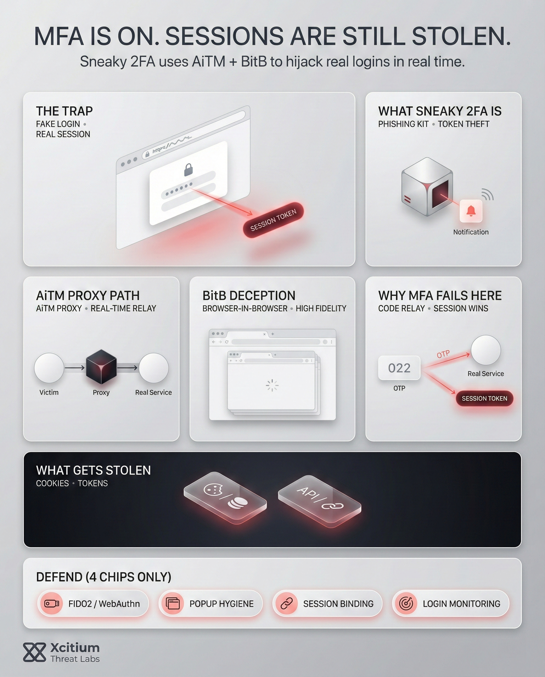 Sneaky 2FA is a reminder that modern phishing is no longer about stealing passwords, it is about stealing sessions. With Adversary in the Middle proxying the login flow and Browser in the Browser popups mimicking trusted brands with high fidelity, even careful users can be tricked into handing over an already authenticated session.
