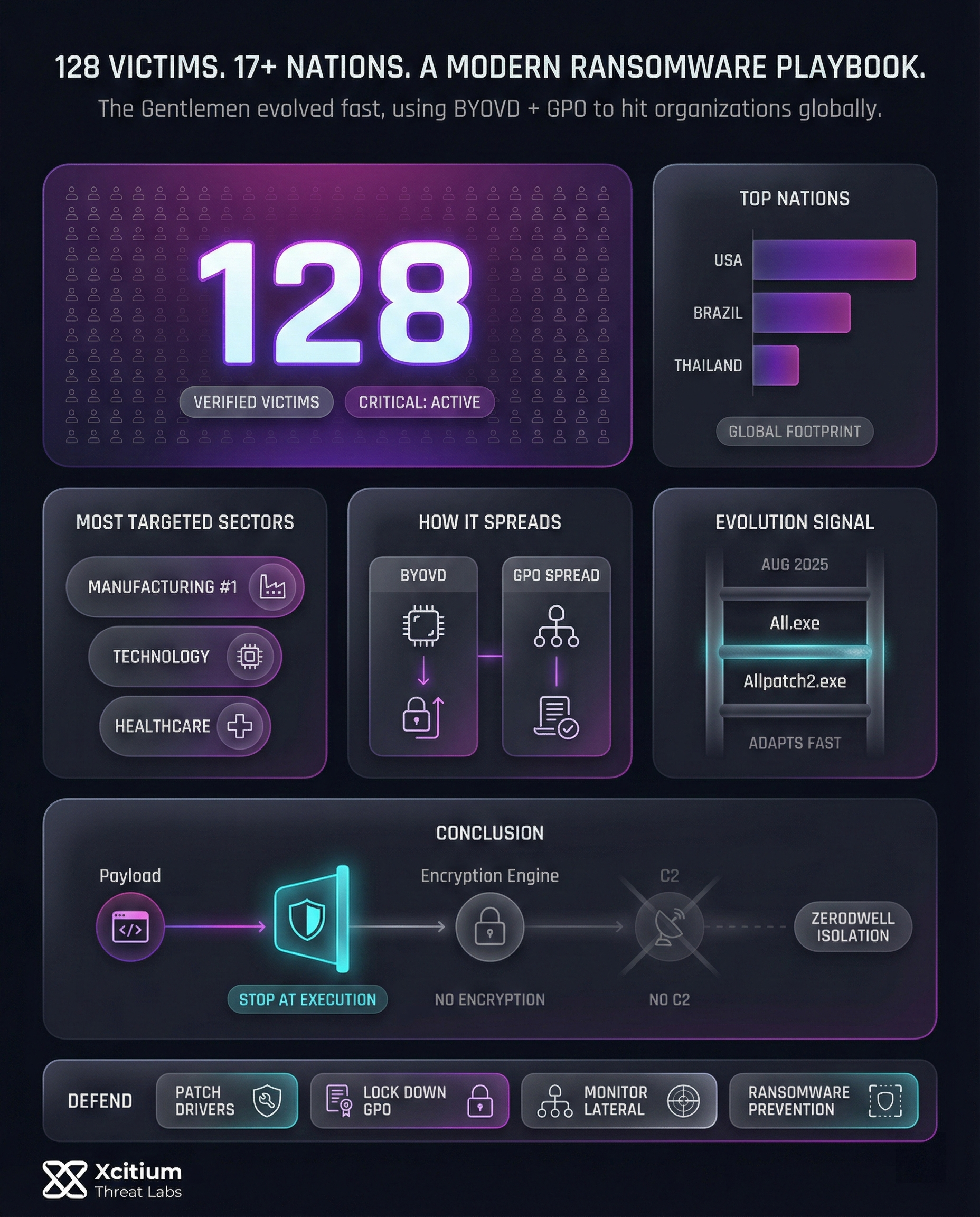 The Gentlemen is not a noisy smash and grab ransomware crew. It studies your environment first, then uses custom tooling, BYOVD privilege escalation, and domain-wide deployment via GPO to turn one foothold into enterprise scale impact. That is why this threat is rising fast, and why it is showing up across multiple countries and sectors.