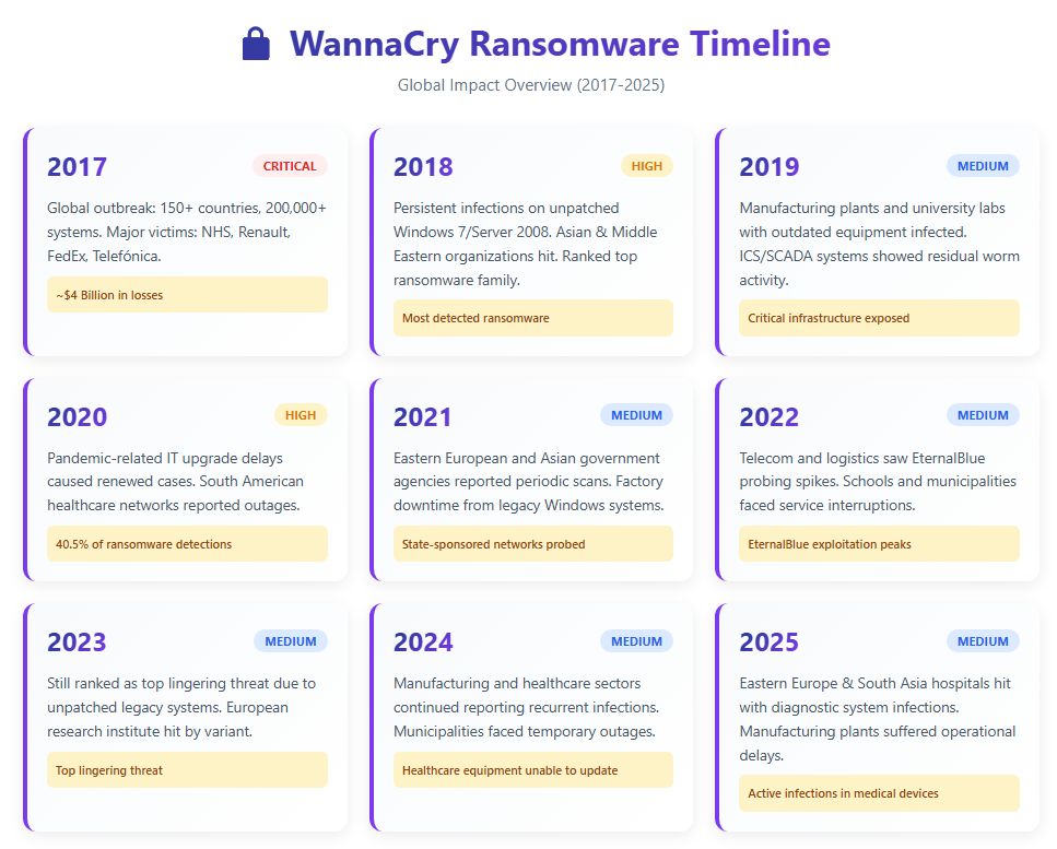 Even in 2025, WannaCry has not fully disappeared. Although the original outbreak was mitigated, the malware continues to resurface in environments that still rely on outdated or unpatched Windows machines. Security researchers consistently observe active variants, automated scanning attempts, and opportunistic attacks exploiting the same underlying vulnerabilities. This persistence underscores that WannaCry is not merely a historical event; it remains a real and ongoing threat for organizations that have not fully closed the gaps exposed eight years ago.