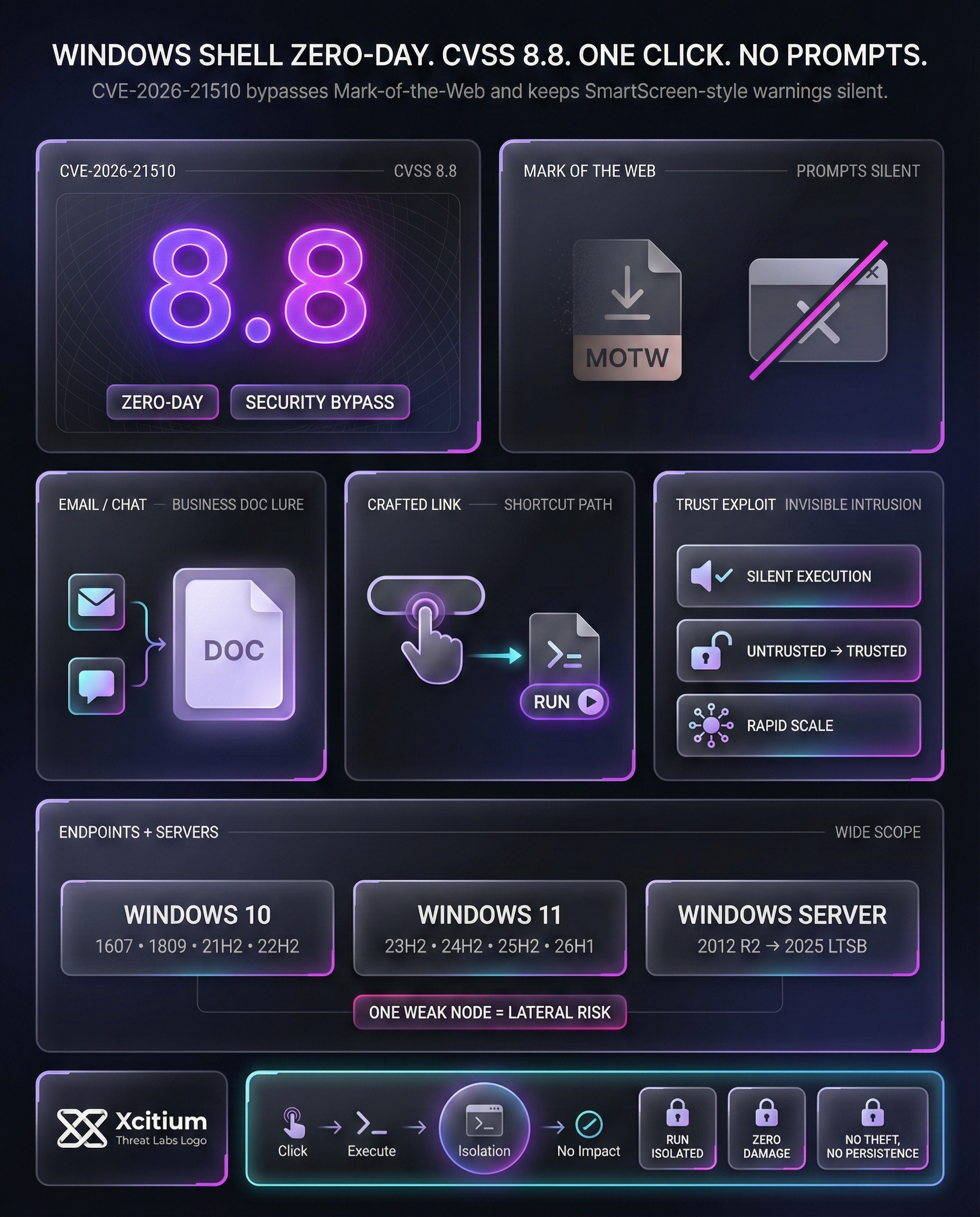 CVE-2026-21510 exposes a dangerous reality, attackers can turn everyday Windows actions into silent compromise. By bypassing Mark of the Web and muting SmartScreen style warnings, a single click on a crafted link or shortcut can run code with no security prompts, removing the last moment where users normally stop and reconsider.